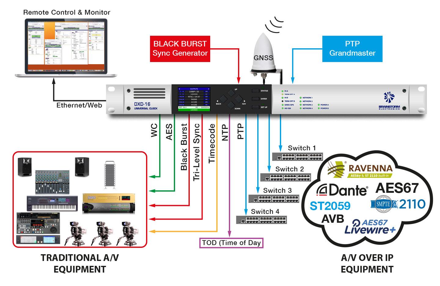 | BrainstormのDXDシリーズは、IPへの移行を容易にするよう設計されています。 フラッグシップモデルDXD-16は、 GPSレシーバーとマルチフォーマットレガシーリファレンスジェネレーターを備えたPTPグランド・マスタークロックです。 PTP環境で動作している間、DXD-16はレガシー機材をIPインフラと完全に同期させてます、または、逆もまた同様です。 |